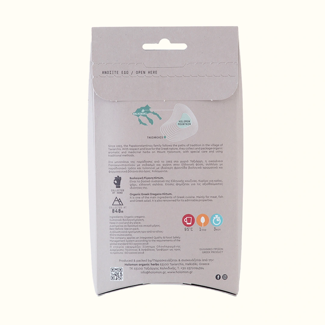 Der Bio-Oregano von HOLOMON organic herbs wird im Juli 2-3 Tage nach der Vollblüte auf dem Berg Holomontas in einer Höhe von 884m – 1160m gesammelt. Die Auswahl der Kräuter richtet sich nach ihrem Wachstumsstadium. Wir sammeln immer die Teile der Pflanze, die für die Herstellung der Produkte geeignet sind, ohne jedoch ihr Wachstum zu beeinträchtigen. Die geeigneten Stämme werden von Hand geerntet und anschließend in speziell angelegten natürlichen Trocknungsräumen ohne den Einsatz von Umweltmaschinen getrocknet.