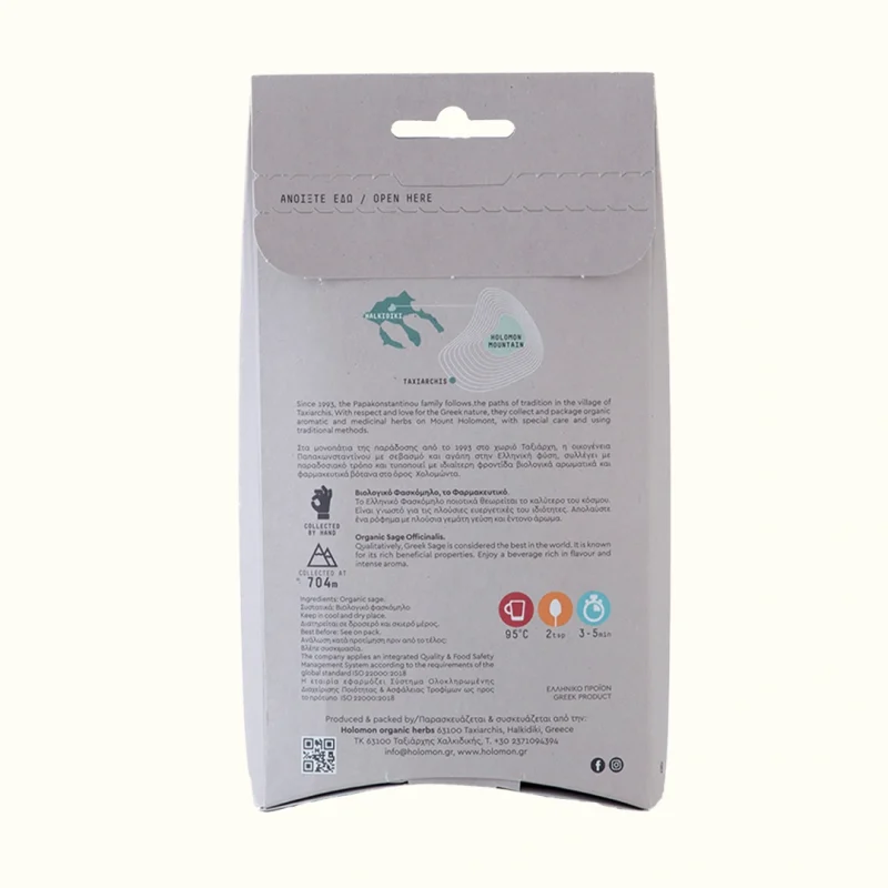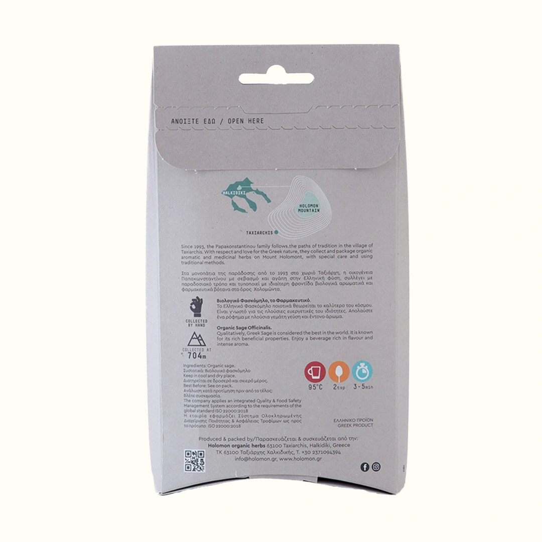 Der Bio-Salbei (Officinalis) von HOLOMON Bio-Kräuter wird im Juni kurz vor der Blütezeit auf dem Berg Holomontas in einer Höhe von 704 m gesammelt. Die Auswahl der Kräuter richtet sich nach ihrem Wachstumsstadium. Wir sammeln immer die Teile der Pflanze, die für die Herstellung der Produkte geeignet sind, ohne jedoch ihr Wachstum zu beeinträchtigen. Die geeigneten Stämme werden von Hand geerntet und anschließend in speziell angelegten natürlichen Trocknungsräumen ohne den Einsatz von Umweltmaschinen getrocknet.