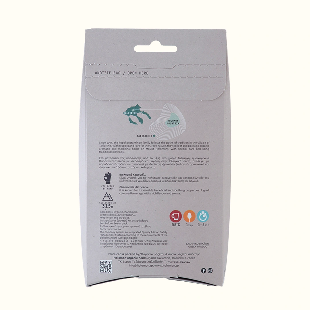 The Chamomile (Matricaria) of HOLOMON organic herbs is collected from the foothills of Mount Holomontas in the months of March – April during its full bloom at an altitude of 315m, The selection of herbs is based on their growth stage. We always collect those parts of the plant that are suitable for the creation of the products, but without inactivating its growth. The suitable stems are harvested by hand and then dried in specially designed natural drying areas, without the use of environmental machinery.