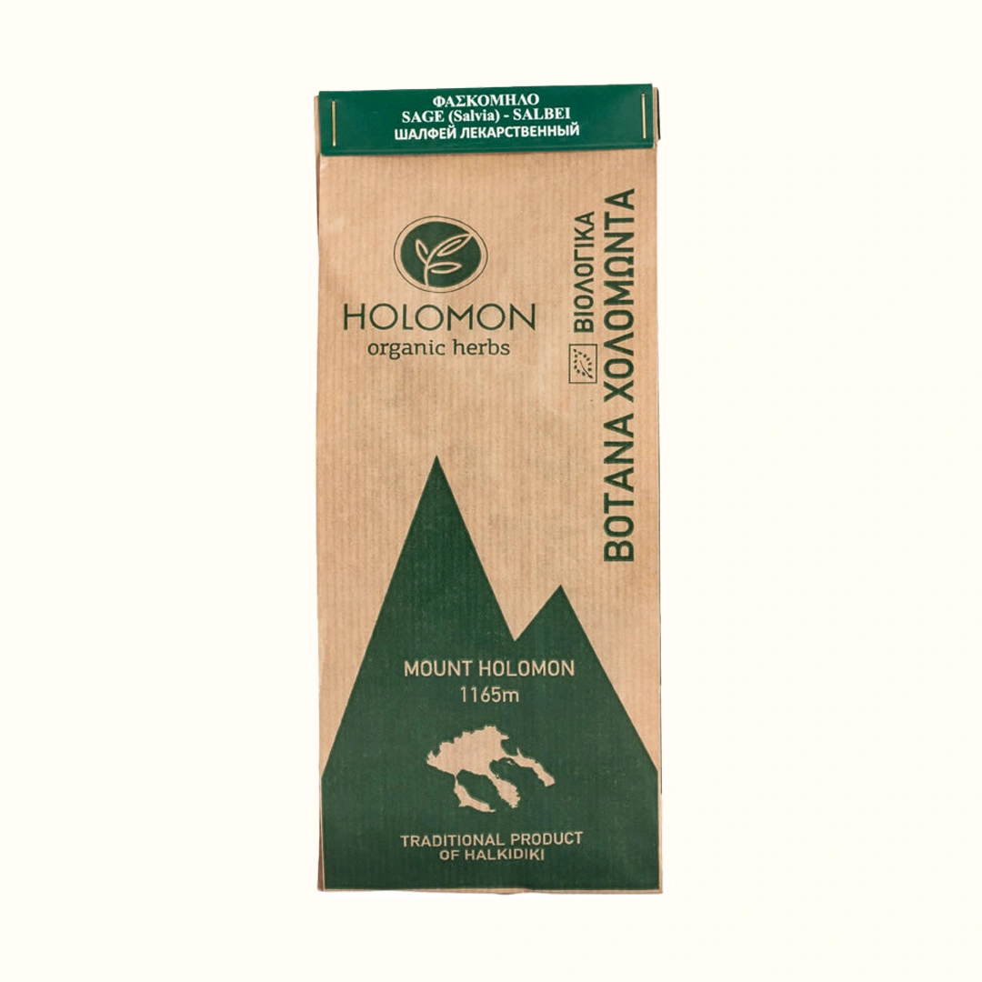 The Organic Sage (Officinalis) of HOLOMON organic herbs is collected from Mount Holomontas in June just before the flowering period at an altitude of 704m. The selection of herbs is based on their growth stage. We always collect those parts of the plant that are suitable for the creation of the products, but without inactivating its growth. The suitable stems are harvested by hand and then dried in specially designed natural drying areas, without the use of environmental machinery.