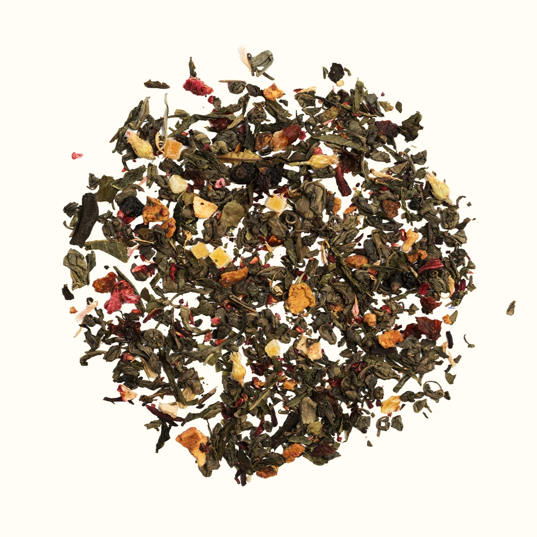 Πράσινο Τσάι, Μάγκο, Ιβίσκος, Φραγκοστάφυλο, Άγριο Τριαντάφυλλο και Μούρα. Μία φανταστική σύνθεση με ολόκληρα κομμάτια φρούτων που συνθέτουν ένα ρόφημα με έντονο άρωμα και φρουτώδη γεύση. Πλούσια σε αντιοξειδωτικές ιδιότητες και βιταμίνες.