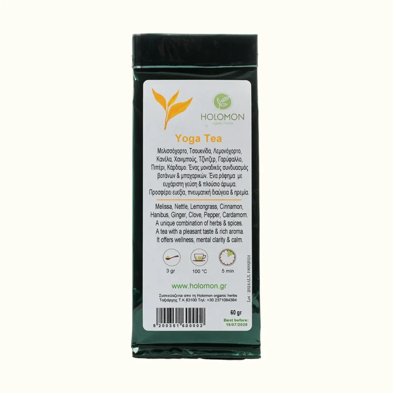 Το Yoga Tea της Holomon με Μελισσόχορτο, Τσουκνίδα, Λεμονόχορτο, Κανέλα, Χανιμπούς, Τζίντζερ, Γαρύφαλλο, Πιπέρι, Κάρδαμο είναι ένας μοναδικός συνδυασμός βοτάνων & μπαχαρικών. Πρόκειται για ένα ρόφημα με ευχάριστη γεύση και πλούσιο άρωμα που προσφέρει ευεξία, πνευματική διαύγεια και ηρεμία.